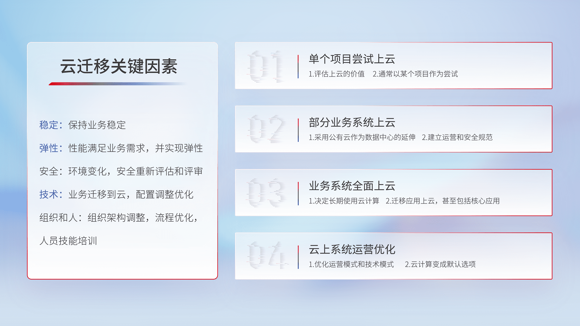 结合实际业务,,,从规划设计、、、云平台选型、、云原生改造、、数据迁移、、集成交付,,,,迁移全过程为客户识别最佳上云路径,,做好风险识别管理,,设计网络架构、、、、身份权限、、安全审计合规、、操作审计、、、日志审计、、、监控告警策略、、、多站点容灾设计等,,,对云上基础设施进行整体规划,,,,提升IT治理水平,,以满足弹性、、、高可用、、、高性能的需求。。。。