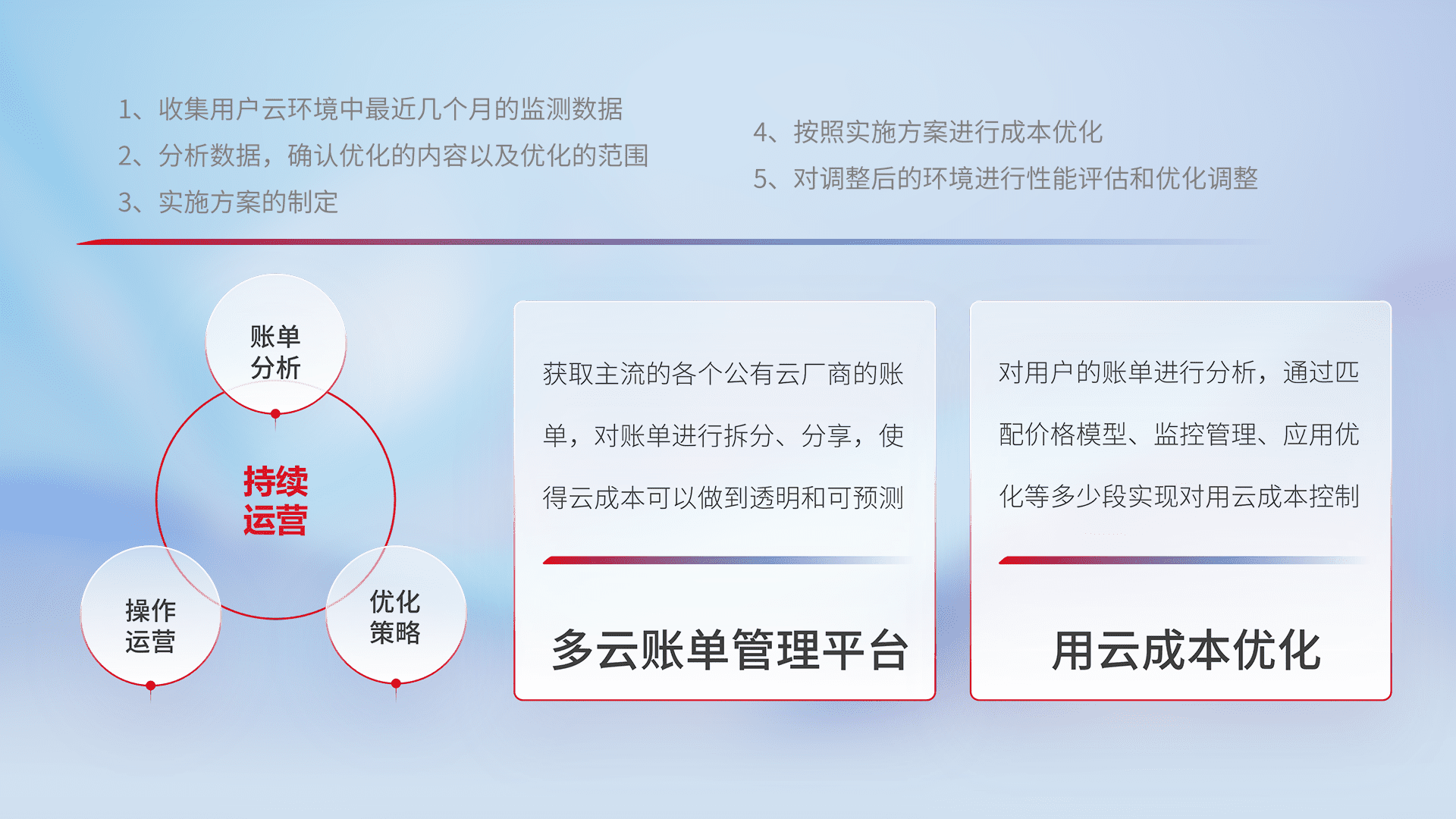 通过多云纳管,,,,以统一的资源数据模型把客户的云资源进行抽象和封装,,,,进而实现对多云资源的统一操作,,,保障云资源管理的可靠性、、、、稳定性与可用性。。。量身定制化运维内容,,,配置、、、、开发运维、、补丁管理、、备份、、、监控、、、认证和访问管理、、、审计和日常巡检等,,,保障在用云过程中的可靠度,,稳定度以及高可用率。。。。