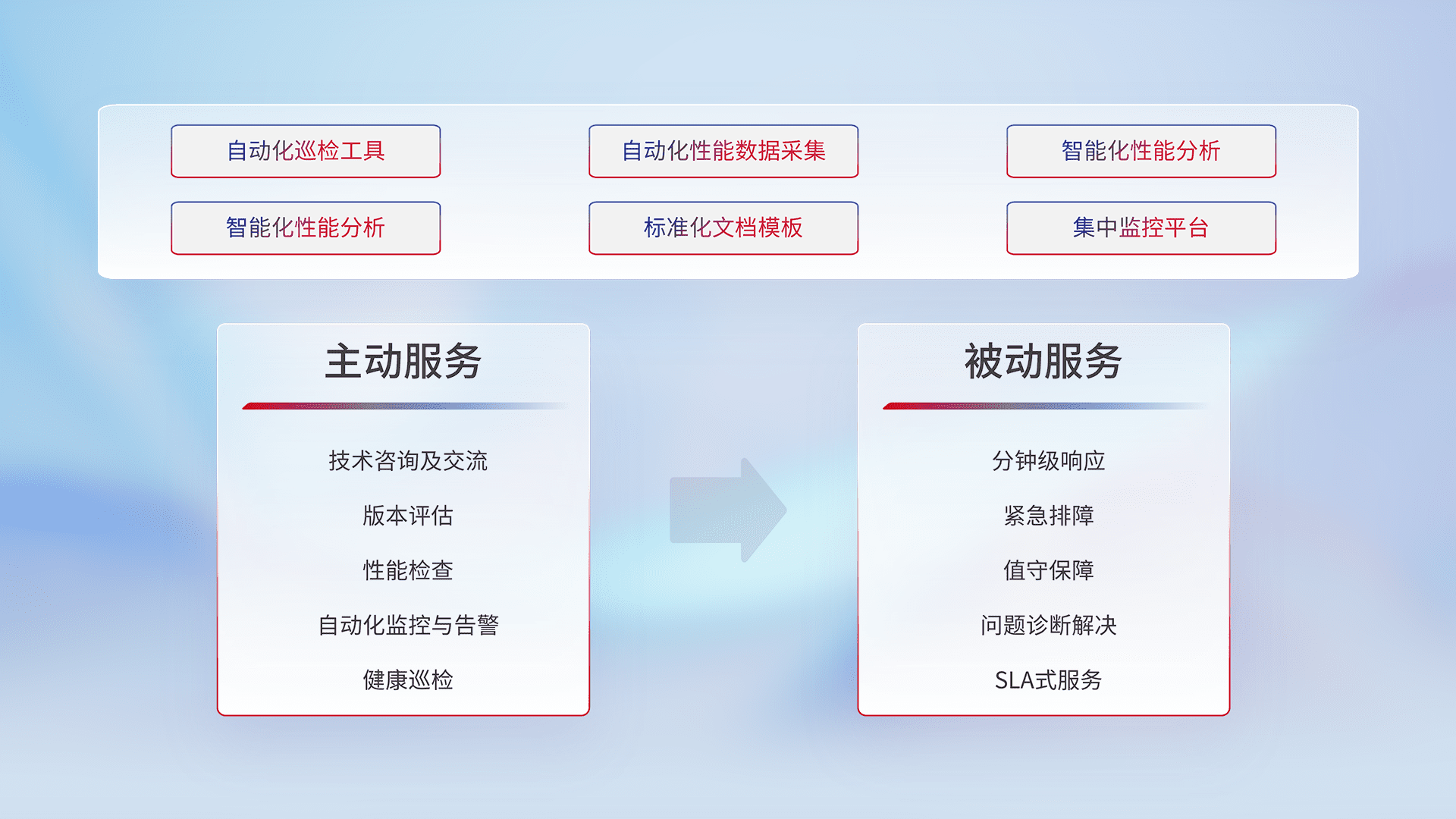 智能化工具和标准化文档,,保障服务质量,,提供主动服务(包含技术咨询、、、版本评估、、性能检查、、、自动化监控与告警、、、健康巡检)和被动服务包含(分钟级响应、、、紧急排障、、值守保障、、、问题诊断解决、、、SLA服务)。。。